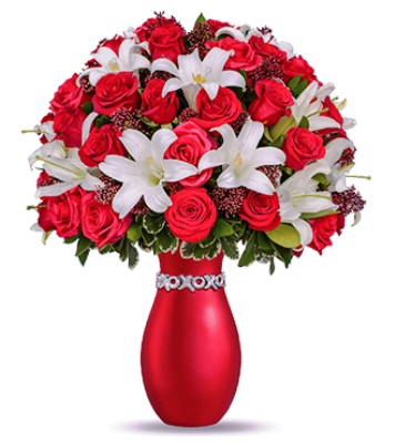 17 adet Kırmızı Gül, 12 Adet Beyaz Lilyum ve aksesuarlardan oluşan özel vazo hediyeli lüks aranjman