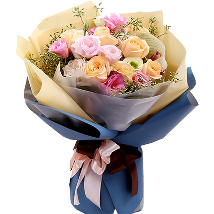 Malzemeler: 7 krem ​​gül, beyaz ve pembe eustomaria, yeşillik, dekorasyon dalları.