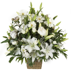 Ürün sepet içerisinde 4 dal beyaz lilyum , 5 adet beyaz gül , 5 adet beyaz gerbera ve dekoratif yapraklardan oluşmaktadır , ürünün oratalama boyutları yükdeklik   cm genişlik  cm dir ..