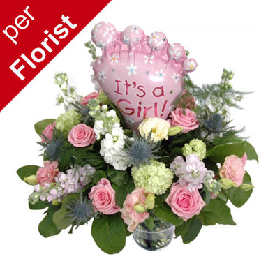 Ürün  Pembe renkli çiçekler ve balondan oluşan yeni bebek kız bebek çiçeği , New Babay