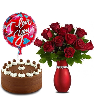 Ürün seramik kırmızı vazo içerisinde düzenlenmiş 12 kırmızı gül 1000 gr çikolatalı pasta ve seni seviyorum yazan balondan oluşmaktadır