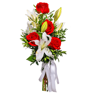 4 Kırmızı gül 2 dal beyaz lilyum dan oluşan buket