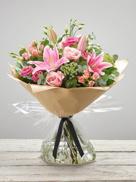 Pembe Oryantal zambaklar, pembe iri başlı güller, pembe sprey güller, pembe lisianthus  okaliptüs ve salal ile elle bağlanmış ve Hediye Paketleme bölümünde sunulmaktadır.